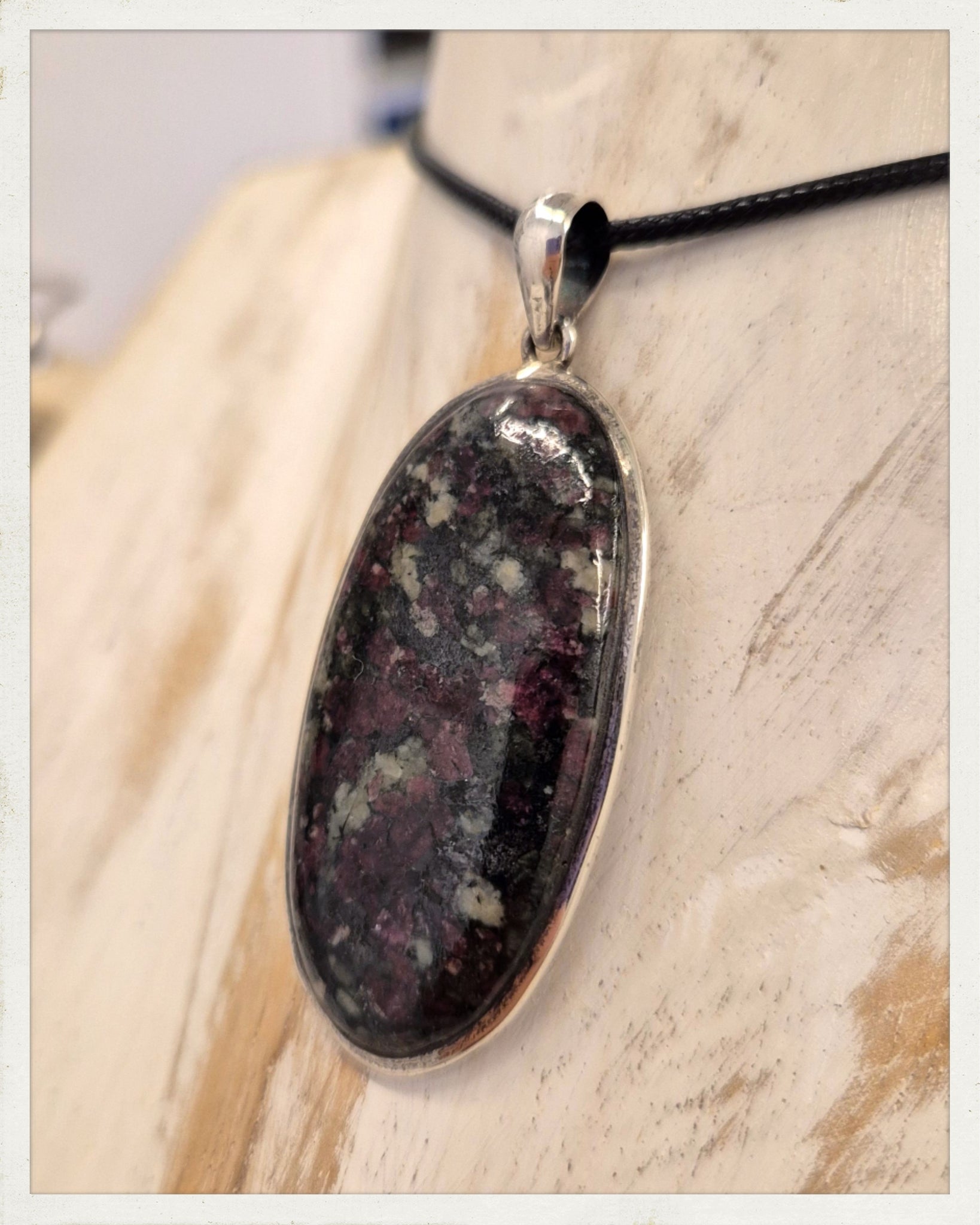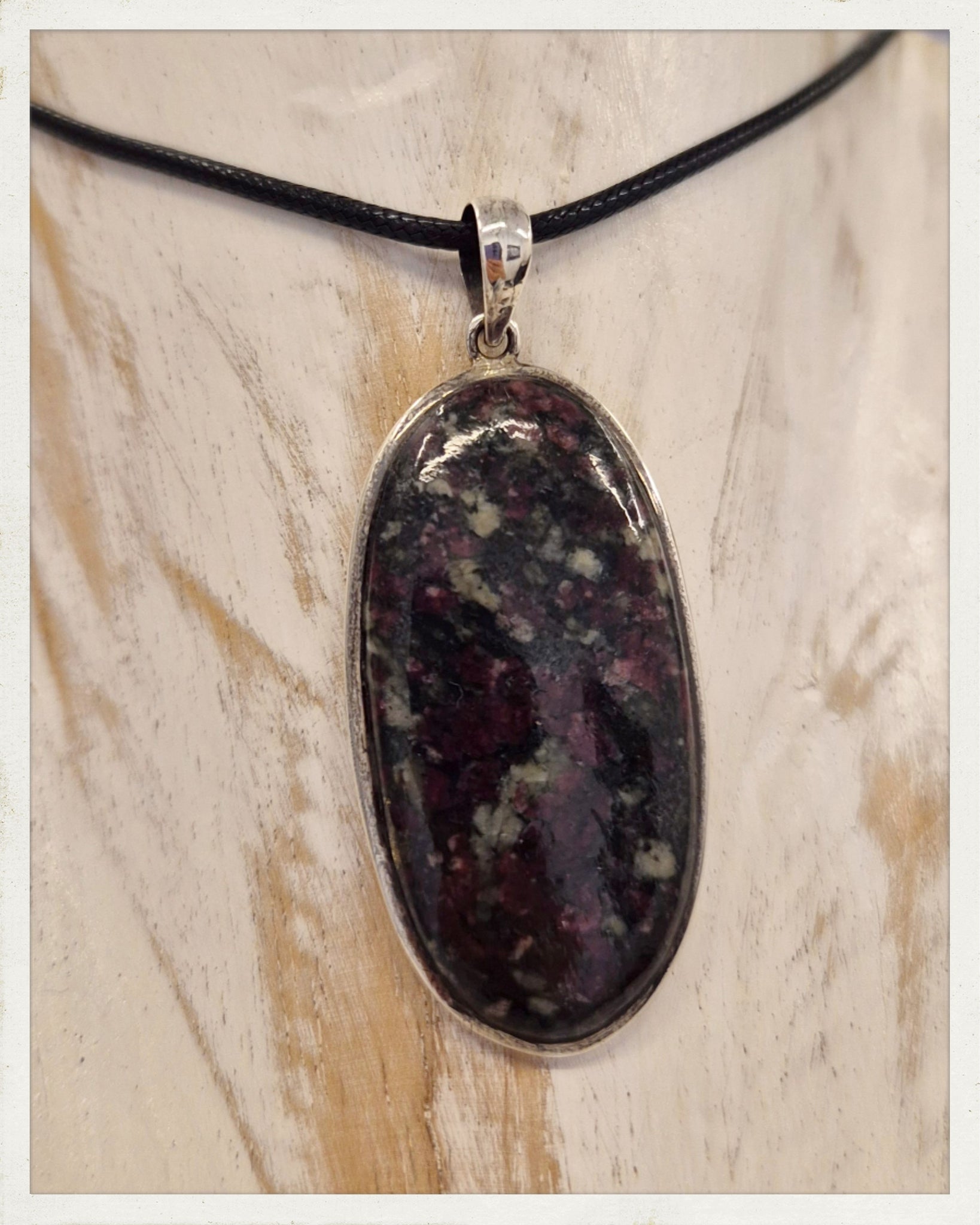 Precioso colgante de eudialita de forma ovalada, con cerco de plata. Incluye cordón con cierre metálico.