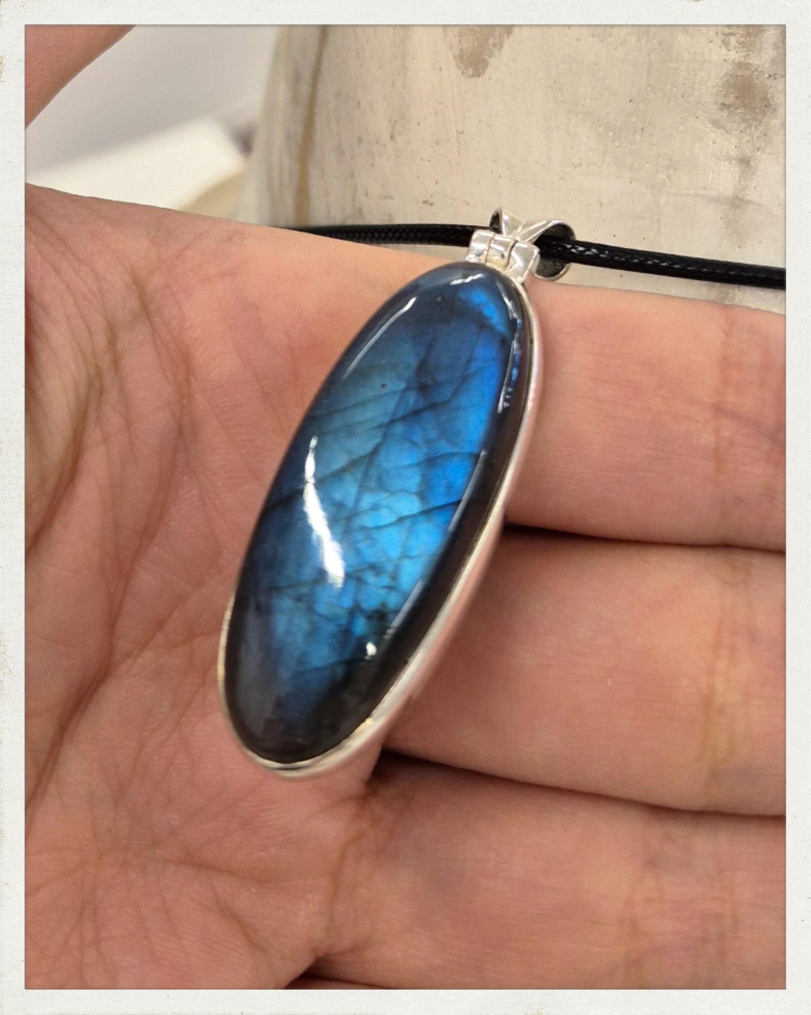 Precioso colgante de labradorita, con cabujón en forma ovalada alargada, de gran brillo y espectacular labradorescencia en tonos azules, procedente de Madagascar, engastado en plata 925. Incluye cordón de algodón encerado con cierre metálico.