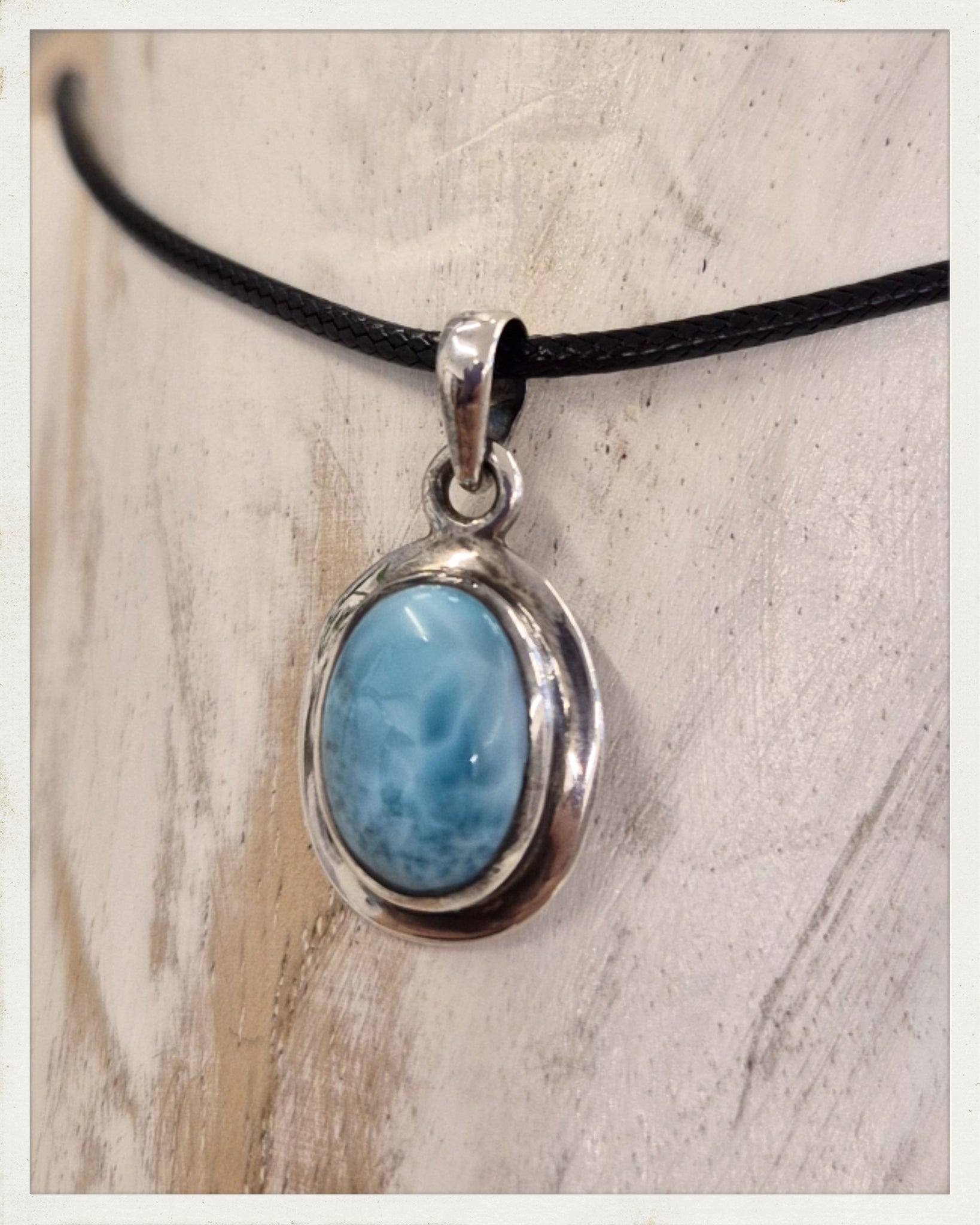 Precioso colgante de larimar (variedad de pectolita que únicamente se encuentra en República Dominicana), con cabujón en forma ovalada y cerco de plata 925. Incluye cordón de algodón encerado con cierre metálico.