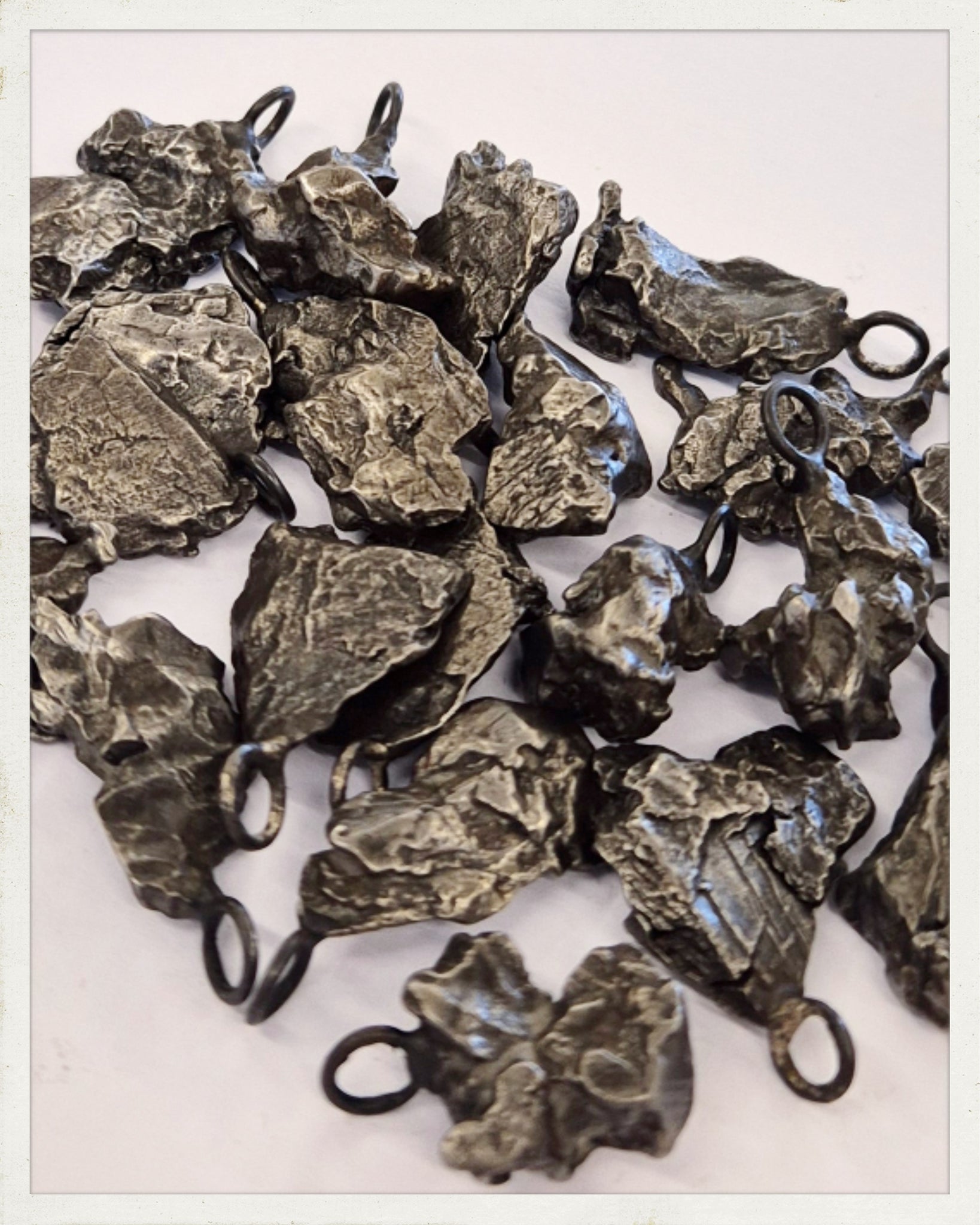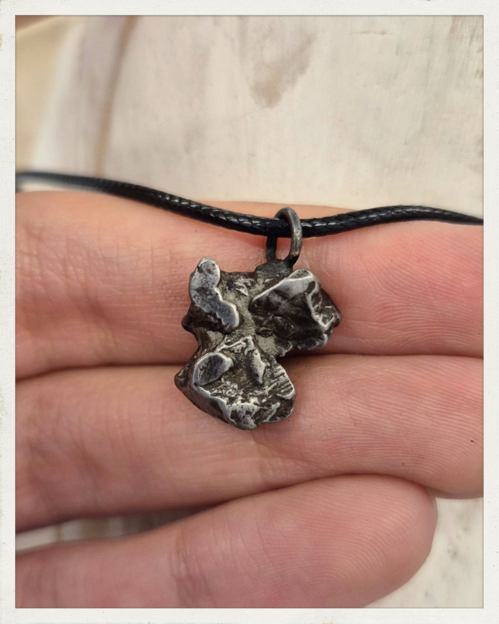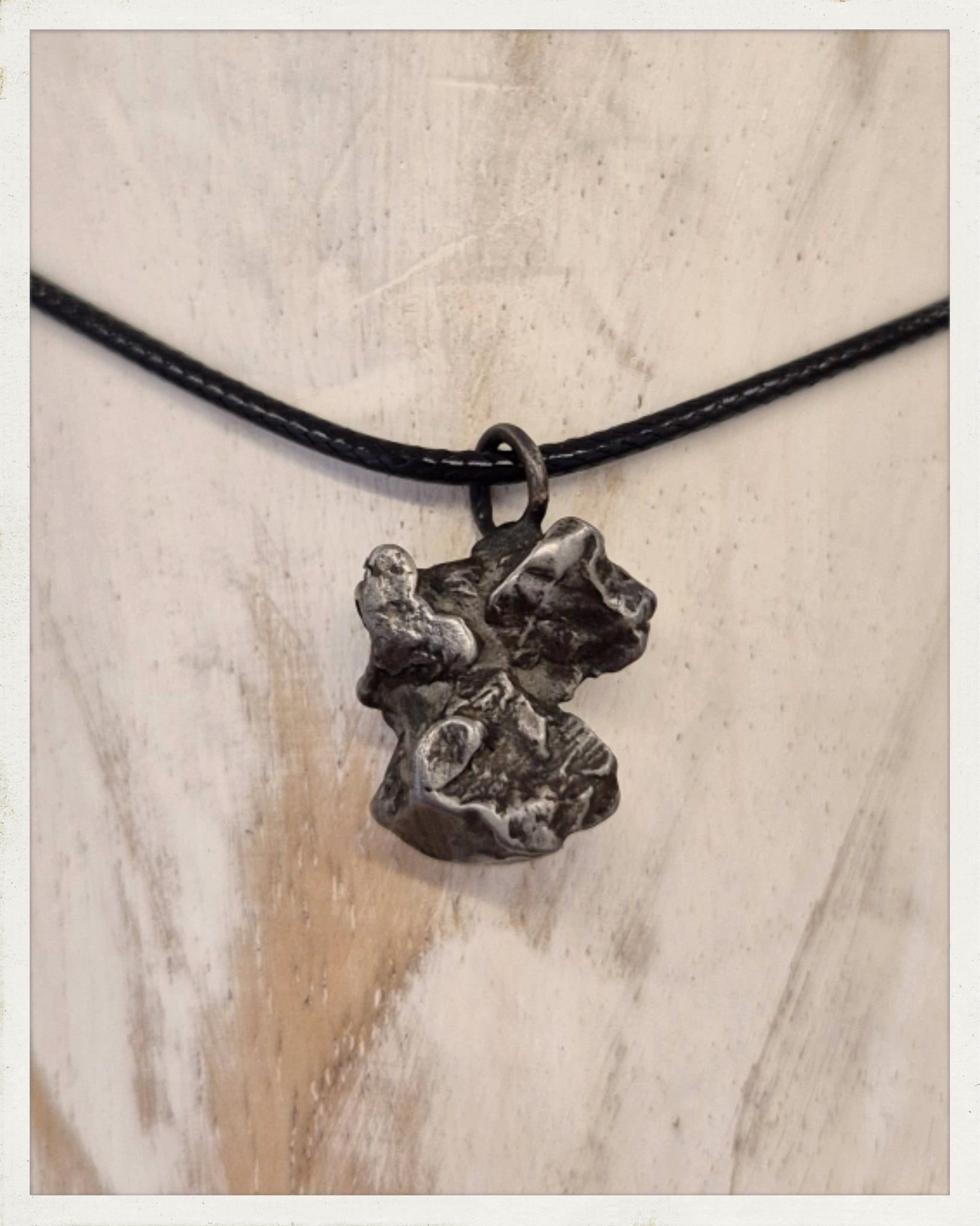 Colgante de meterorito, compuesto principalmente de hierro y níquel, procedente de Campo del Cielo, Argentina, lugar en el que impactó hace aproximadamente 4800 años, y que fue descubierto en el siglo XVI. Incluye cordón con cierre metálico.