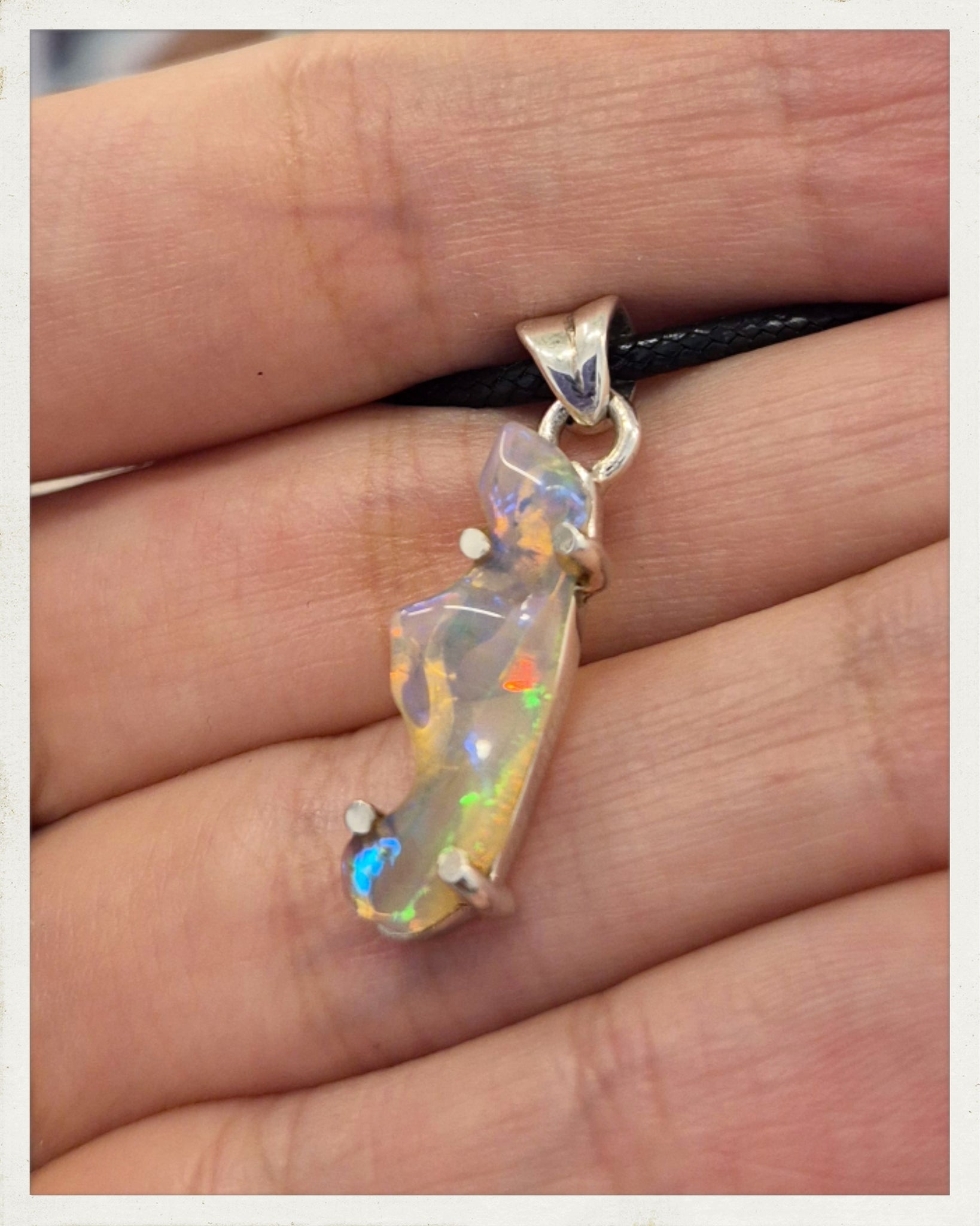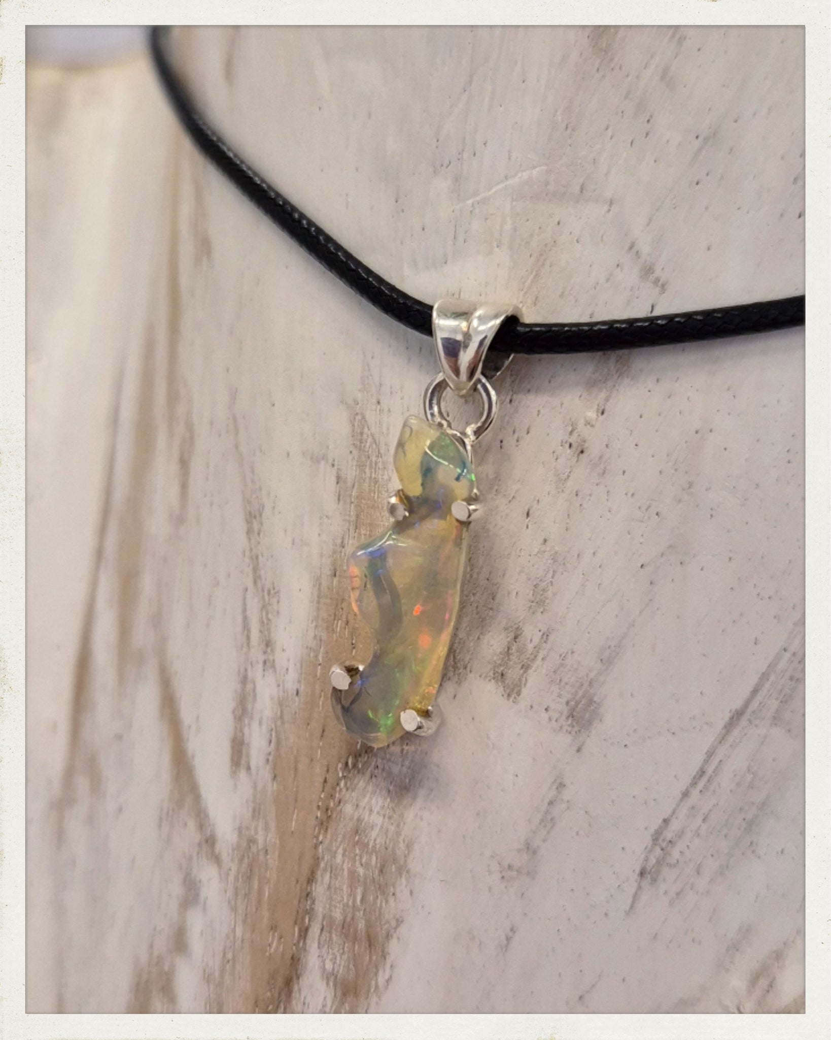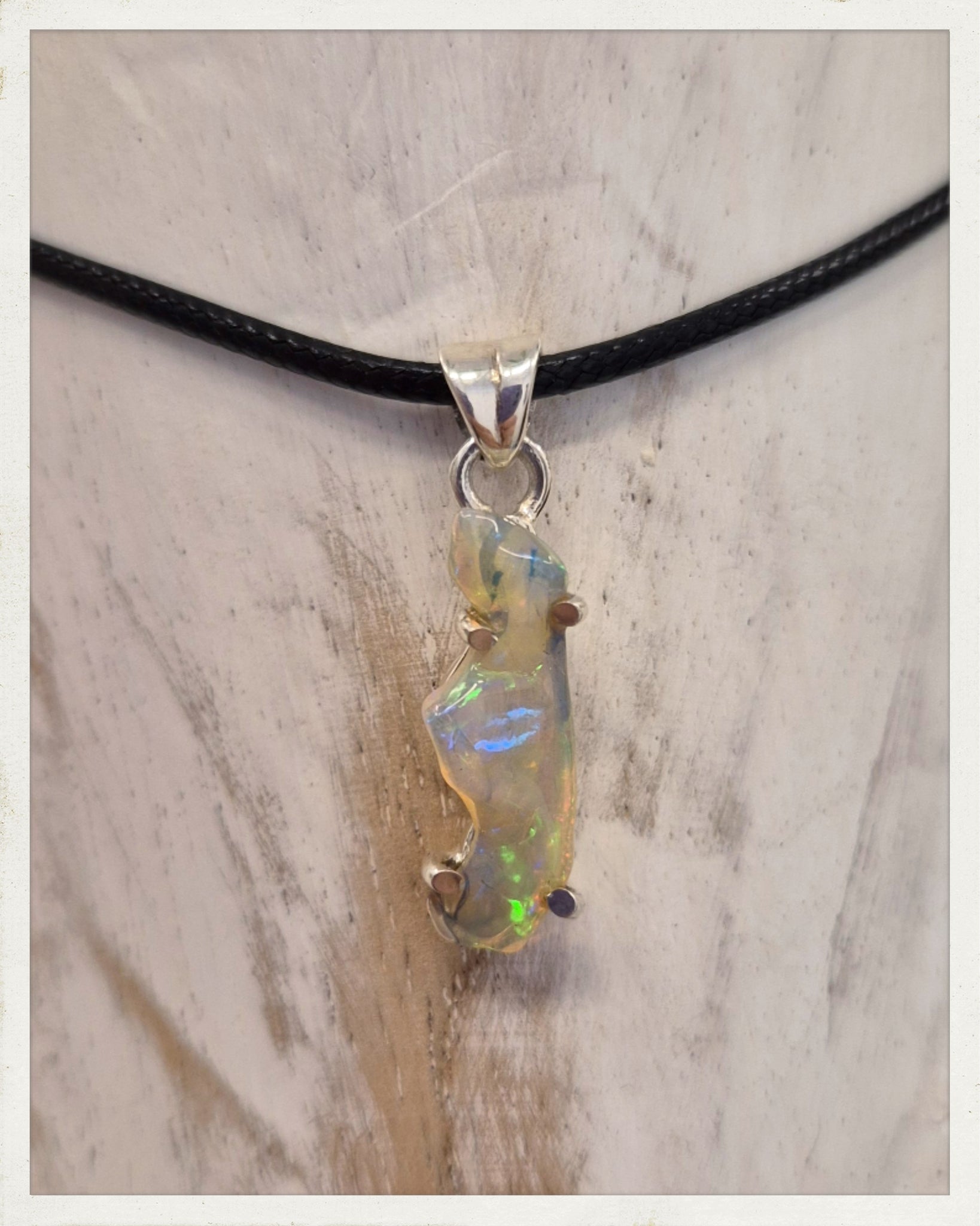 Espectacular colgante de plata y ópalo noble, alargado, engastado con garras, de gran brillo y espectacular opalescencia en tonos azules, verdes, amarillos y rojos, procedente de la provincia de Wollo, Etiopía, una de las localizaciones más apreciadas por los amantes del ópalo.