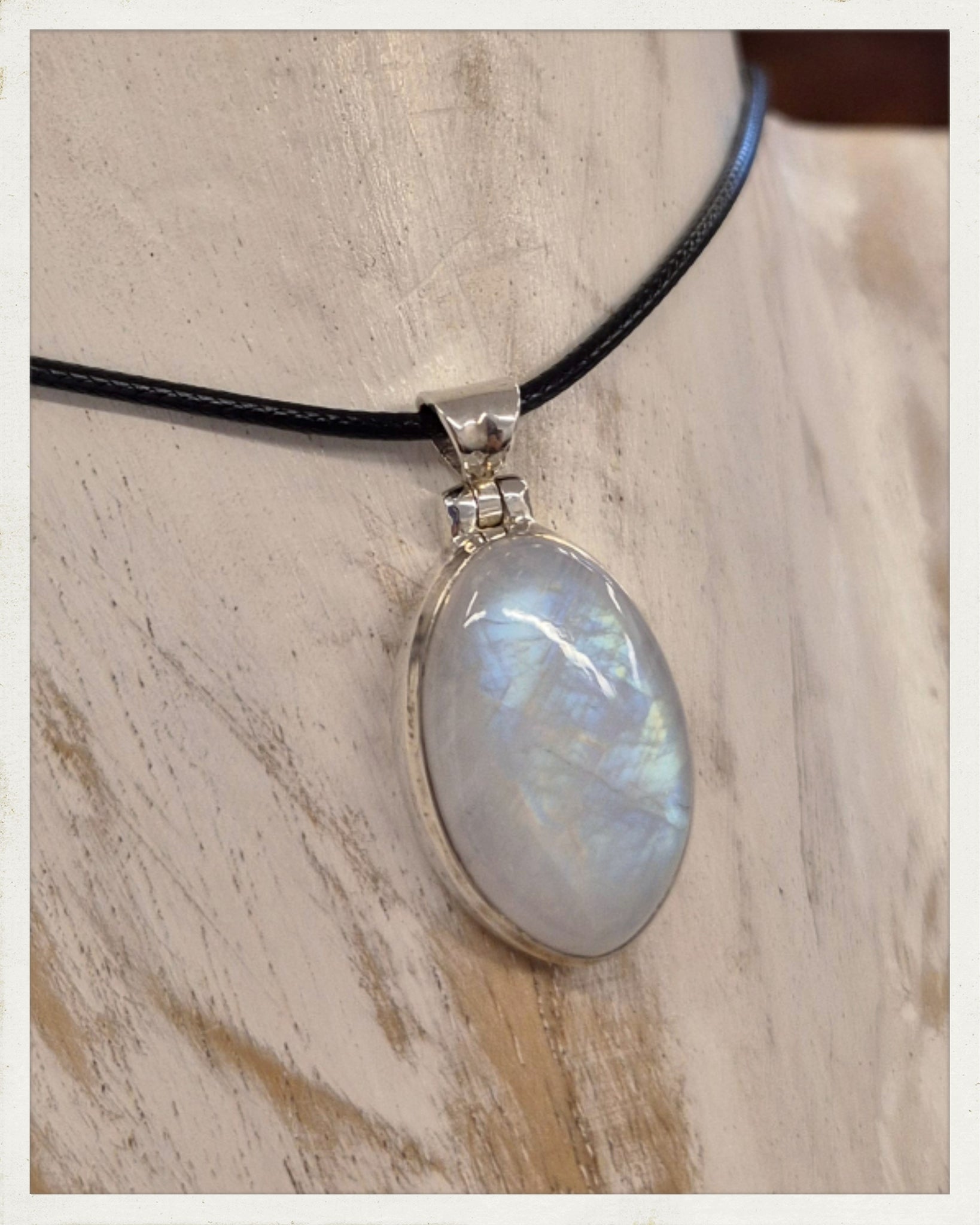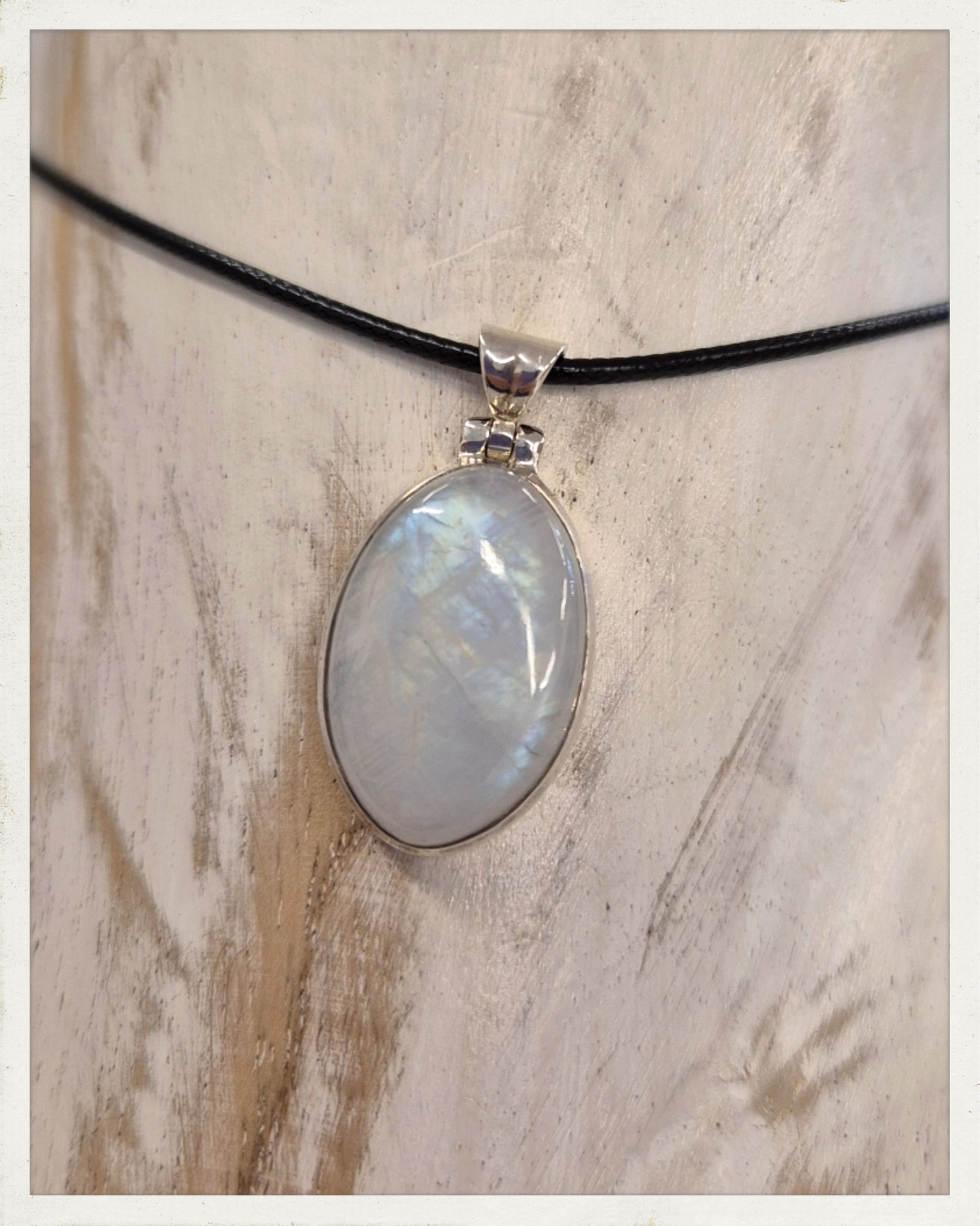 Precioso colgante de piedra luna (variedad labradorita blanca), con cabujón en forma ovalada, de gran brillo y espectacular labradorescencia en tonos azules, verdes y amarillos, procedente de La India, engastado en plata 925. Incluye cordón de algodón encerado con cierre metálico.