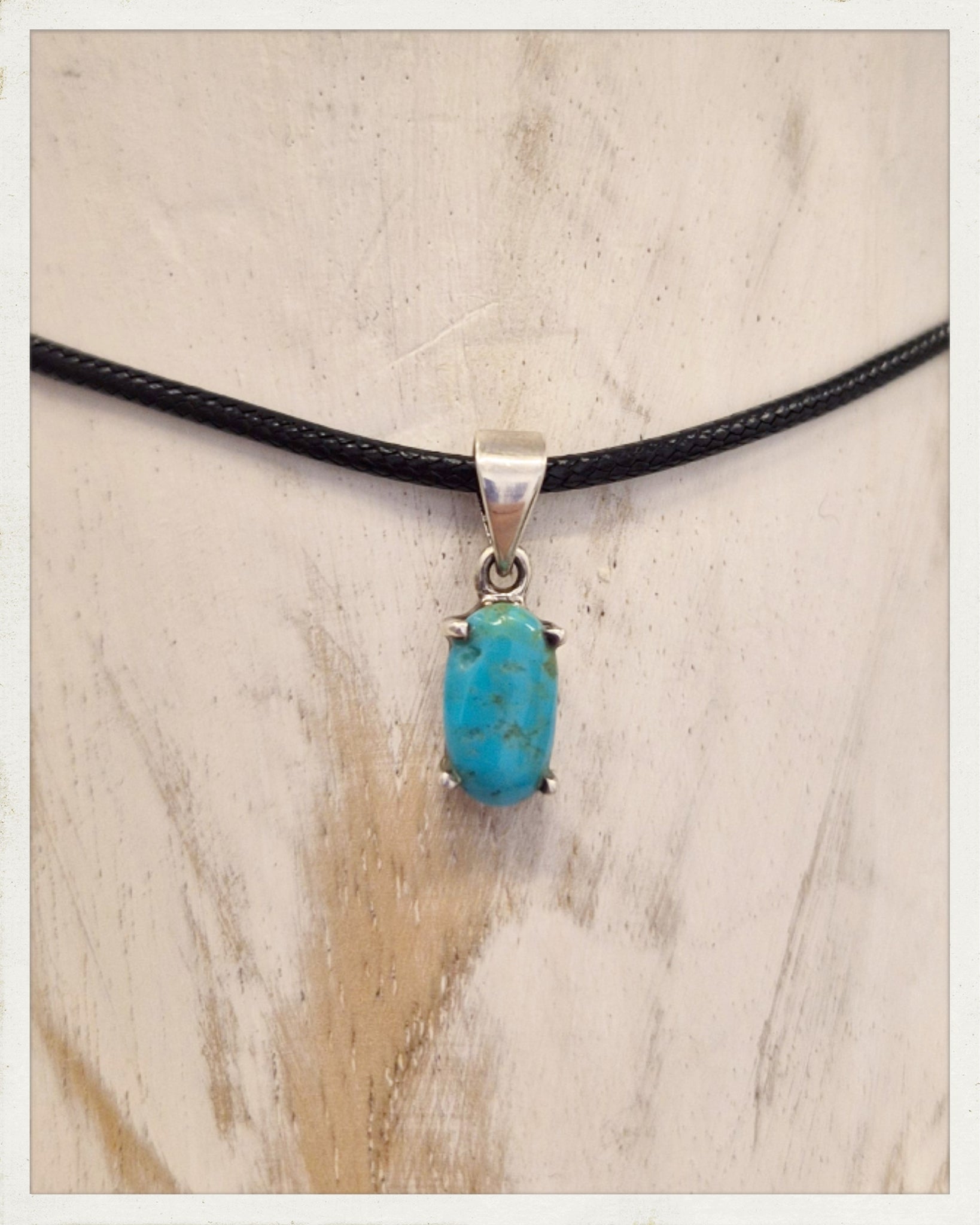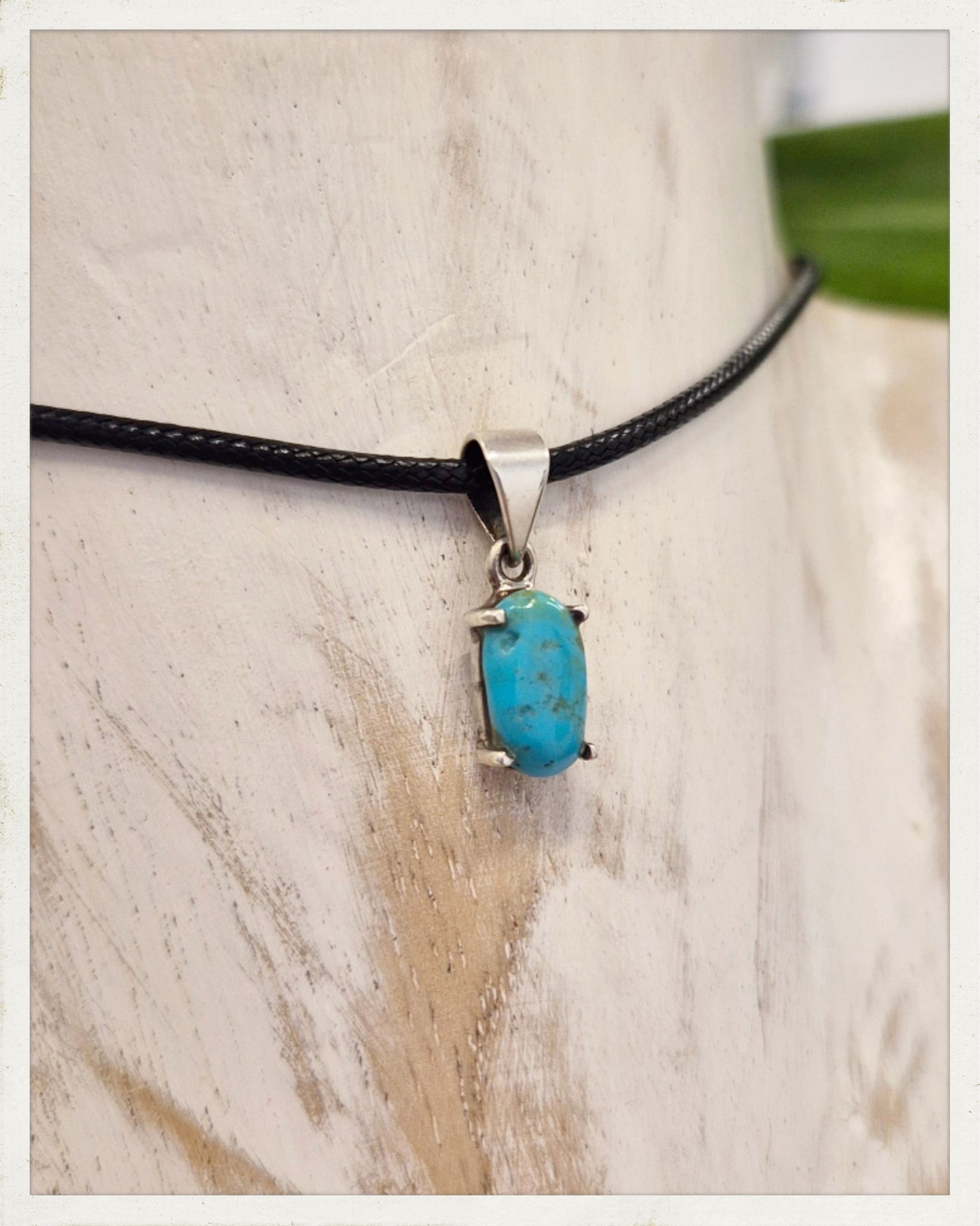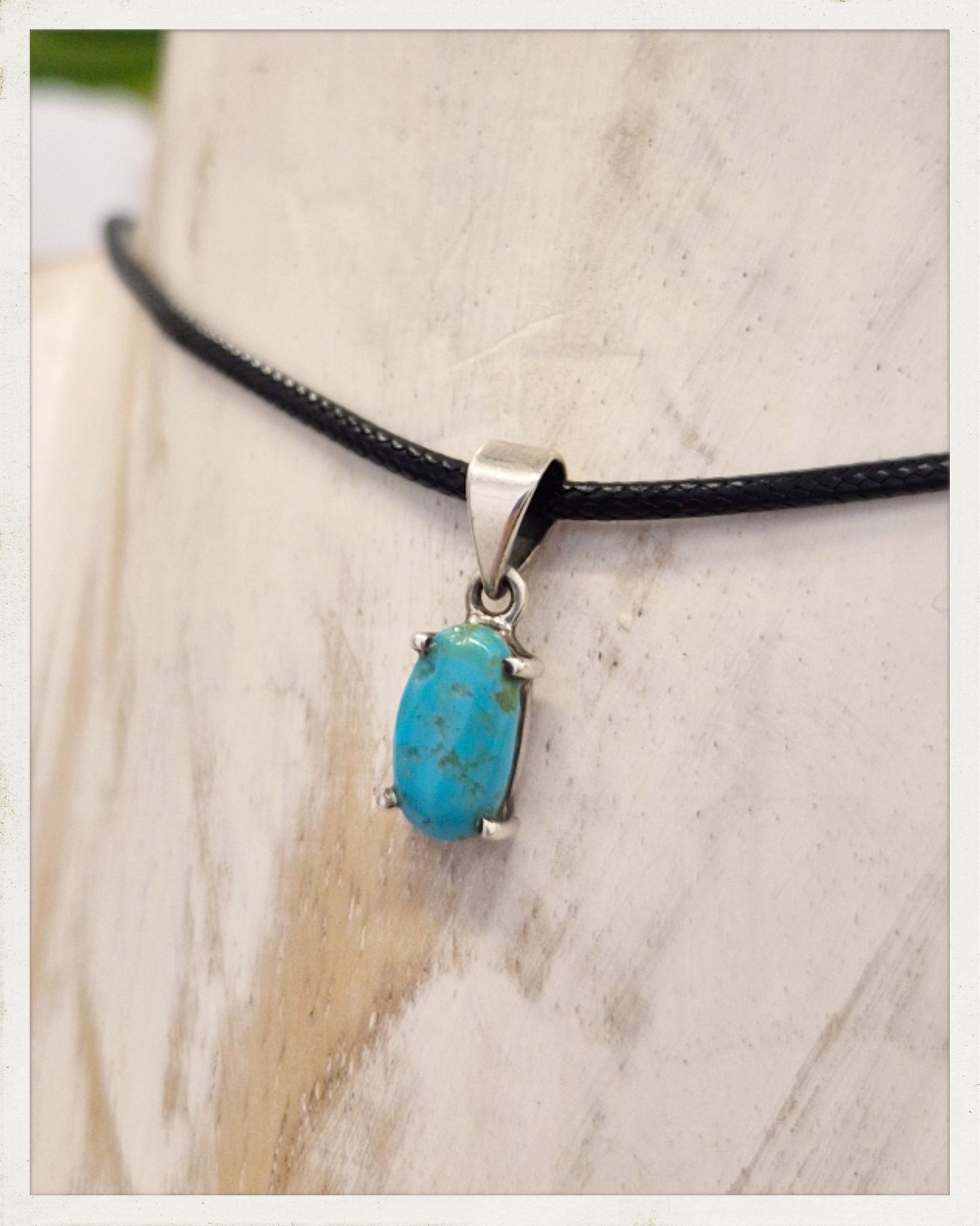 Pequeño colgante de turquesa engastado en plata, de precioso color azul. Incluye cordón con cierre metálico.