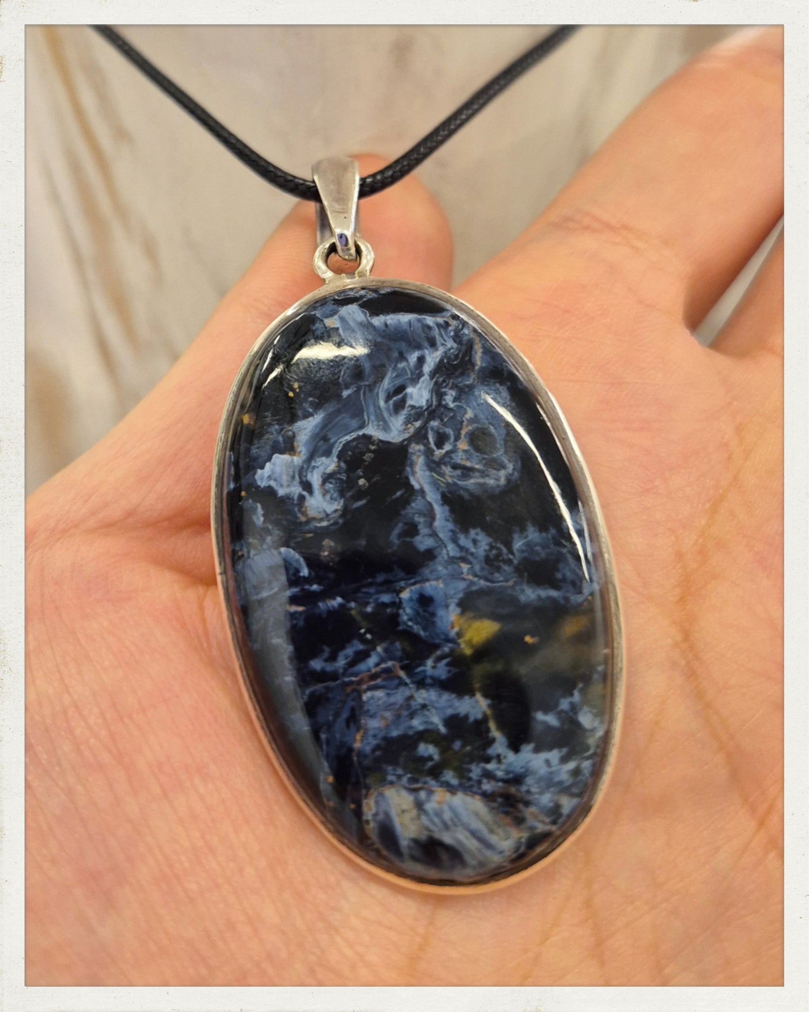 Espectacular colgante de pietersita ovalada con cerco de plata. Incluye cordón con cierre.
