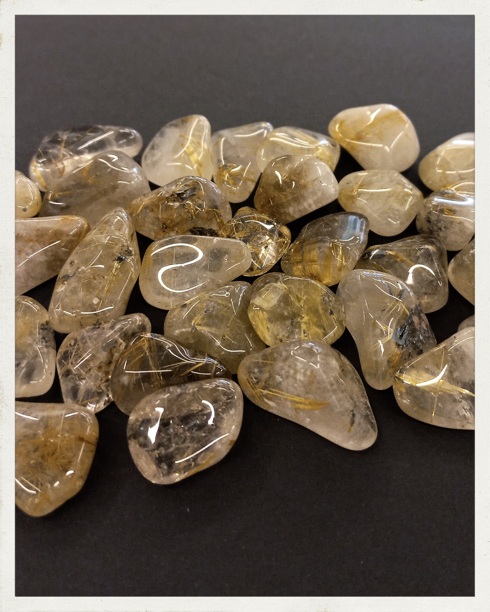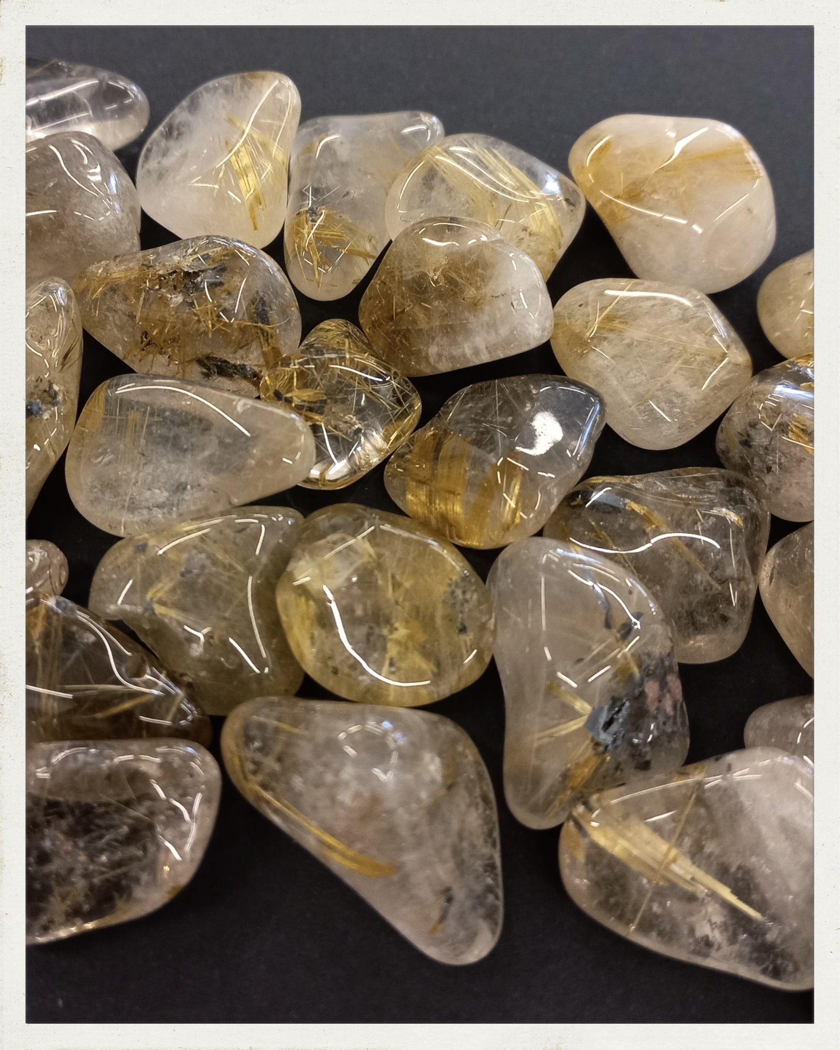 Rodados irregulares de cuarzo rutilado, en los que se pueden apreciar con claridad las preciosas agujas doradas y rojizas de rutilo, el mineral conocido como "cabello de Venus".