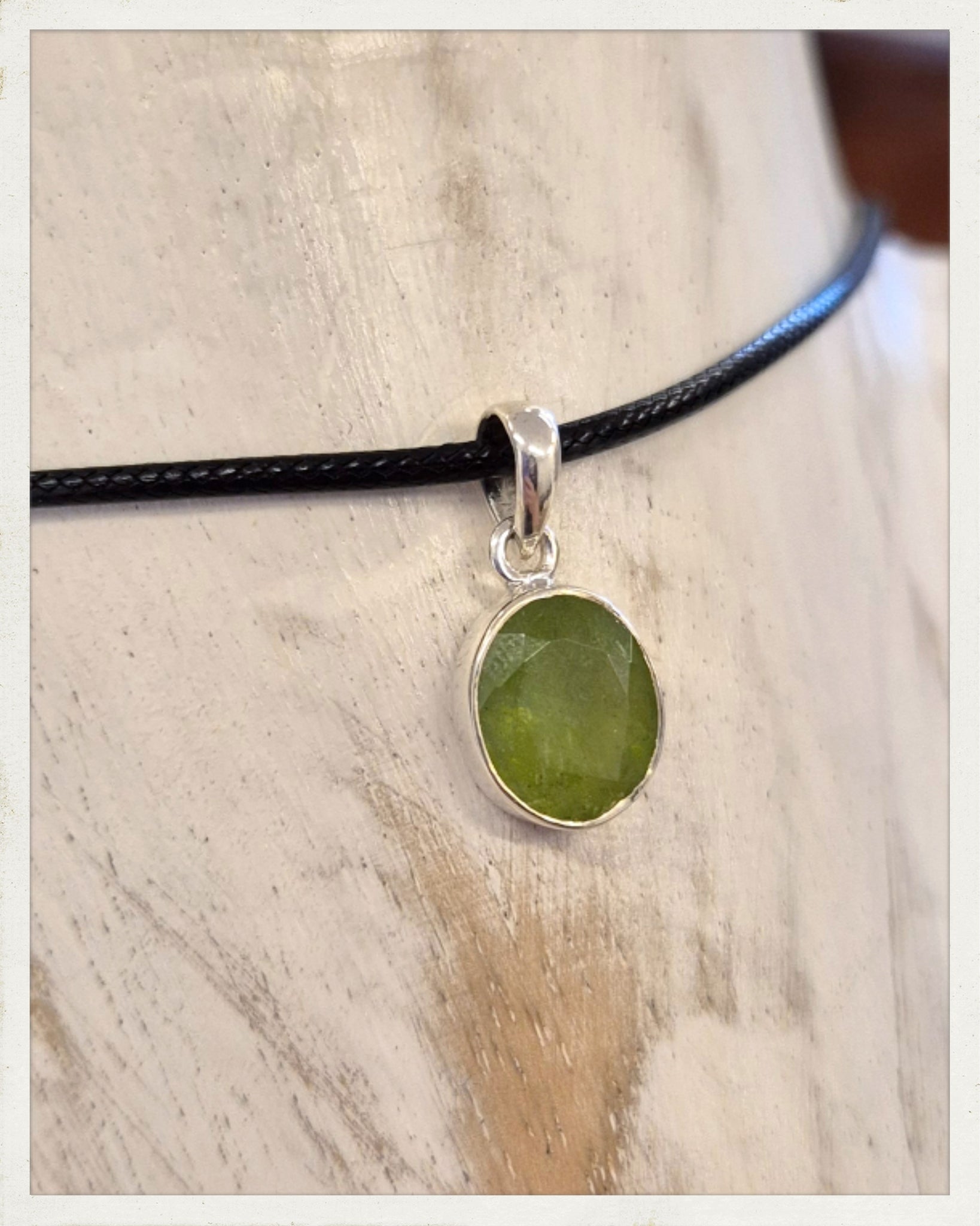 Precioso colgante de plata 925 y peridoto (olivino) tallado en óvalo, de intenso color verde, procedente de EE.UU. Incluye cordón de algodón con cierre metálico.